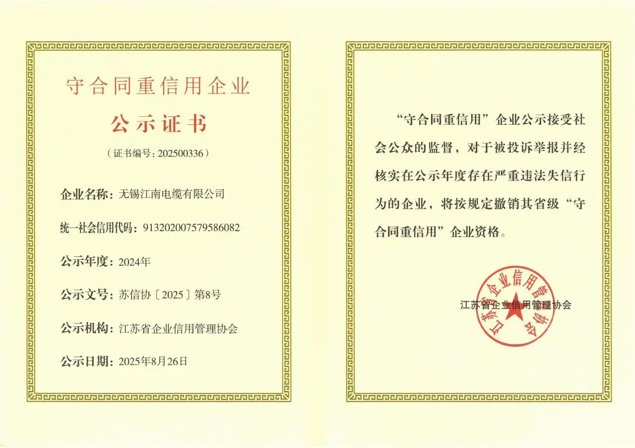 近日,江蘇省企業信用管理協會發布2024年度省級“守合同重信用”公示企業名單,江南電纜再次獲評“省級守合同重信用”企業。